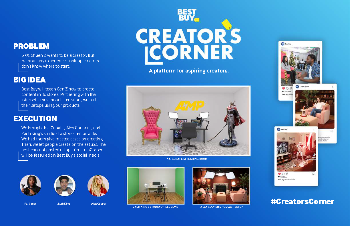 Solution: Best Buy will teach Gen Z how to create content in its stores. Partnering with the internet’s most popular creators, we built their setups using our products so that aspiring creators now have a place to create.